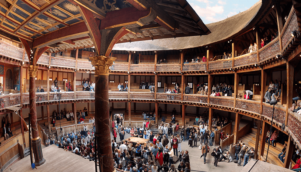The initial architectural ideas of the Globe Theatre were quite interesting. Its round shape resembled an amphitheatre that could accommodate approximately 3,000 spectators. It was made mostly of wood. That was the reason the fire of 1613 spread and destroyed everything around so quickly. The main feature of the theatre was its roof, which covered only the stage. It housed a statue of Hercules holding the globe on his shoulders. The roof was painted blue and resembled the sky. It also featured a hatch through which a person could descend on a rope. In addition, there were two doors beneath that were used by actors entering the stage. You could feel the special atmosphere and spirit of that place reading the inscription above its entrance – “Totus mundus agit histrionem”, which translates as “All the world’s a stage.”